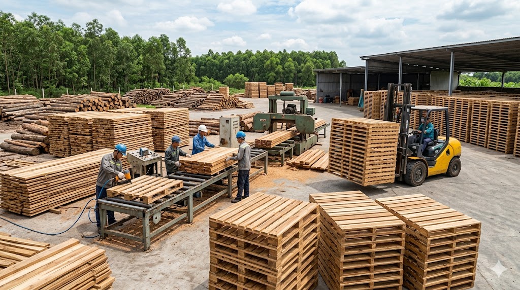 Tin tức Quy Trình Sản Xuất Pallet Gỗ Tràm Chuyên Nghiệp Tìm hiểu quy trình sản xuất pallet gỗ tràm từ khâu chọn nguyên liệu, xẻ gỗ, sấy, đóng pallet đến xử lý hoàn thiện. 04/04/2026